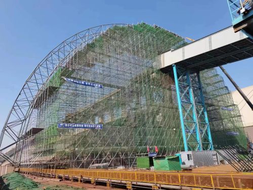 南钢原料场C2料仓网架工程为正方四角锥双层一心圆柱面网壳结构,跨度为72米,长度为 517米,拱高 41.3米,网架厚度 2.85米;理论储量 50万吨,极限储量约80万吨。作为项目中规模最大、施工难度最高的钢结构施工工程,网架滑移起步跨是网架工程中最基础、最关键的一步。