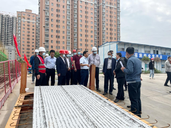 在施工现场,苗志忠一行查看了施工平面图与项目规划图,投建分公司总经理郭军介绍了项目概况、优秀做法以及当前工程进度,调研组对项目部绿色文明施工理念给予了高度评价。随后,苗志忠一行查看了预制混凝土叠合板,极大肯定了项目部在统筹施工与大干、进度与工期、安全与质量的创新做法。苗志忠强调,要做好超前谋划,特别是在施工大干期间,必须牢固树立安全意识与红线思维,认真落实安全生产主体责任,不断强化风险管控与隐患排查,夯实基础,确保质量。