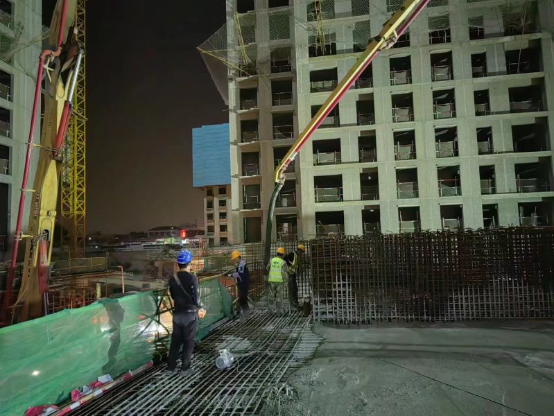 施工过程中,项目部推行优质建造、高效建造、精准建造、智慧建造,大力推广模块化施工、铝模板及加固体系,高强钢筋直螺纹连接技术、大体积混凝土浇筑等新技术,以新技术提升工程整体质量水平。连日来,项目部党员白天紧盯施工现场,监督工程质量,夜深了技术质量人员拖着疲惫的身体,只是擦一点醒脑的风油精,继续熬夜编制大体积混凝土施工方案,提前通过计算优化混凝土配合比,选择生产能力强的混凝土供应商,保证混凝土的质量和供应能力。再看施工现场,灯火通明,在方圆一千平方米的地库施工现场,职工们拖着长长的、沉重的混凝土泵管,将一罐罐混凝土缓缓注入地库钢筋铁骨,经过2天昼夜奋战,随着最后一罐混凝土浇筑完成,标志着城建分公司河北霸州建设道国蕴城项目A区人防车库封顶,累计浇筑混凝土1495立方米。