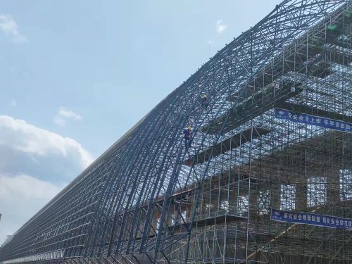 在网架安装过程中,南钢项目部科学组织,克服高温施工及疫情防控影响,积极推进工程进度。增加作业人员,采用24小时全天候滑移,技术人员全程跟踪网架拼装和滑移作业流程,现场协调,保障工序之间有效衔接,对可能干扰到滑移的部位逐一检查,时时对脚手架和网架进行监测,保障施工安全,顺利推进网架施工任务的完成。