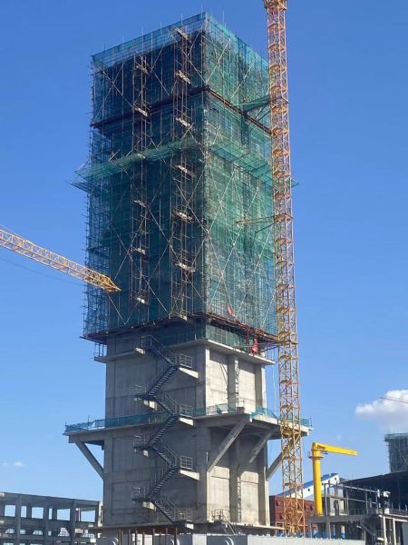 经过一年的艰难施工,熄焦塔的主体结构顺利封顶。熄焦塔作为三大超高主体结构中最高的一个,自然危险系数也是最大的,它始终是整个项目施工中紧绷的一根弦,也给项目施工带来了巨大的挑战。尤其是工程混凝土的浇筑只能依靠从地面到顶端的地泵管,常常因管道堵塞造成施工的长时间停滞,检修困难,此外,塔吊的多次顶升及悬挑架体的搭设等等问题都给施工的正常进展带来巨大挑战。