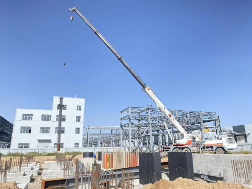 据了解,该项目此次吊装车间总用钢构件量达600余吨,包括劲性钢结构、钢框架结构等。建筑面积为5994.7平方米,建筑层数地上二层。主体结构形式为钢结构,基础形式为独立坡形基础,主车间建筑高度为23.3米,外墙围护结构为泡沫混凝土泄爆板,是项目目前最大的钢结构工程。