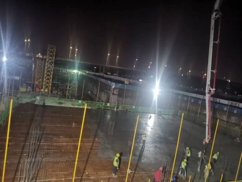 由于施工场地小,施工难度大,交叉作业存在安全隐患等问题。对此,项目部周密部署,认真组织,克服天气影响,对每道工序进行严格把关,组织施工人员进行技术交底,严格明确混凝土的浇筑方法、浇筑注意事项、混凝土强度及配合比要求,确保浇筑过程的安全和质量。为确保浇筑工作顺利进行,施工前,项目精心筹划,多方协调,不断优化施工方案;施工过程中,项目班子成员一线指挥,现场安全员、技术员全程监控,积极应对并处理施工现场出现的各种问题,工人分班轮流作业,确保了首层主体结构混凝土顺利浇筑完成。