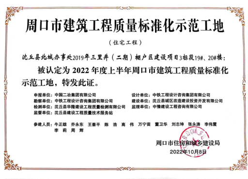 10月8日,中国二冶新型建筑分公司承建的沈丘县北城办事处2019年三里井(二期)棚户区建设项目3标段19#、20#楼获评2022年度上半年周口市建筑工程质量标准化示范工地。