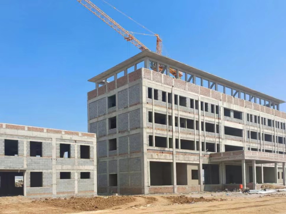 办公区自开工以来,面对地基基础土质不良、土地征收以及多次设计变更等问题,项目部全体人员积极与建设、设计、监理、临沂济铁物流园、中国海关临沂总署单位沟通协调,共同提出解决问题措施和方案。截至2023年4月2日,办公区三个单体二次结构、内墙抹灰和屋面工程已施工完毕。