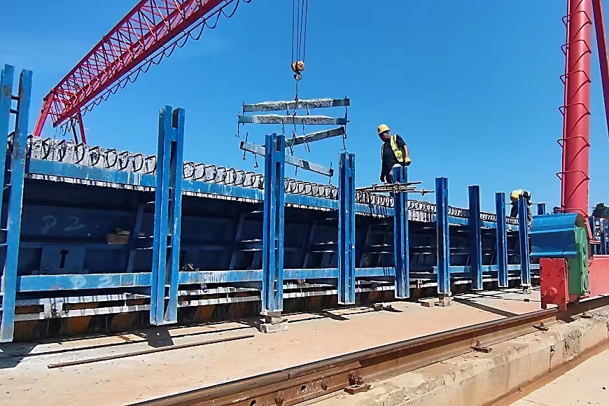 白南高速第二合同段2#预制梁场承担着174片箱梁的生产任务。工程立项后,项目部第一时间组织骨干成员于4月12日进行预制场选址,同时为了保障2023年施工生产指标的顺利完成,项目部组织了场地临建、模板改制、梁底调整、龙门吊安装和办公生活区装修等工作,截止5月25日,完成了全部临建工作,经过50余天的精心筹备,率先实现了首片预制箱梁的顺利生产。