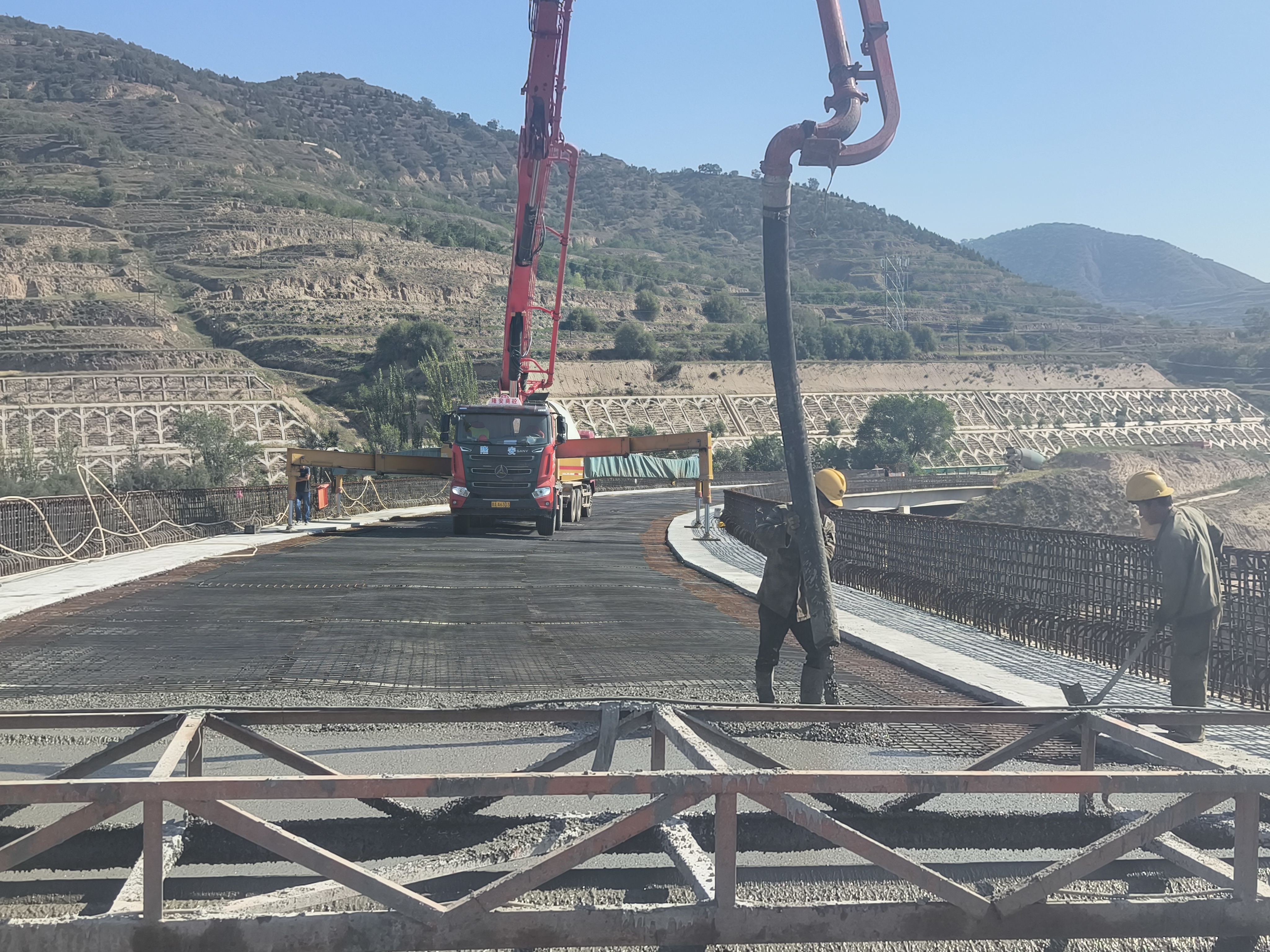 在本次桥面铺装施工前,项目管理团队根据工期、天气变化等因素,科学调整制定切实有效的施工计划,施工人员坚持多布点、高精度高原则,在浇注前后,对竖曲线地段进行测量以及误差调整。按照规范以及监理工程师的要求,首先将桥面板进行凿毛处理,并清理干净,进行测量放样,弹出桥面铺装砼的边线。按照设计要求绑扎桥面铺装钢筋网,钢筋网下设置足够的砼垫块,确保砼浇筑时钢筋网不变形。浇筑混凝土时用平板振捣器将砼振捣密实,用滚轴赶平,再由人工收浆抹平后采用土工布覆盖洒水养生。