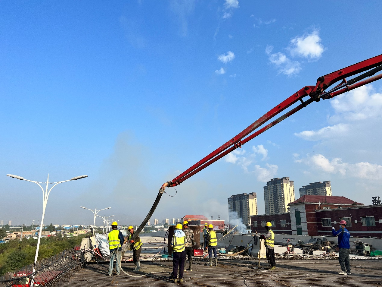 8月28日,市政分公司包头市G110(民族东路—G210)节点快速化改造工程一标段规划四路跨线桥完成钢箱梁混凝土面板浇筑任务。