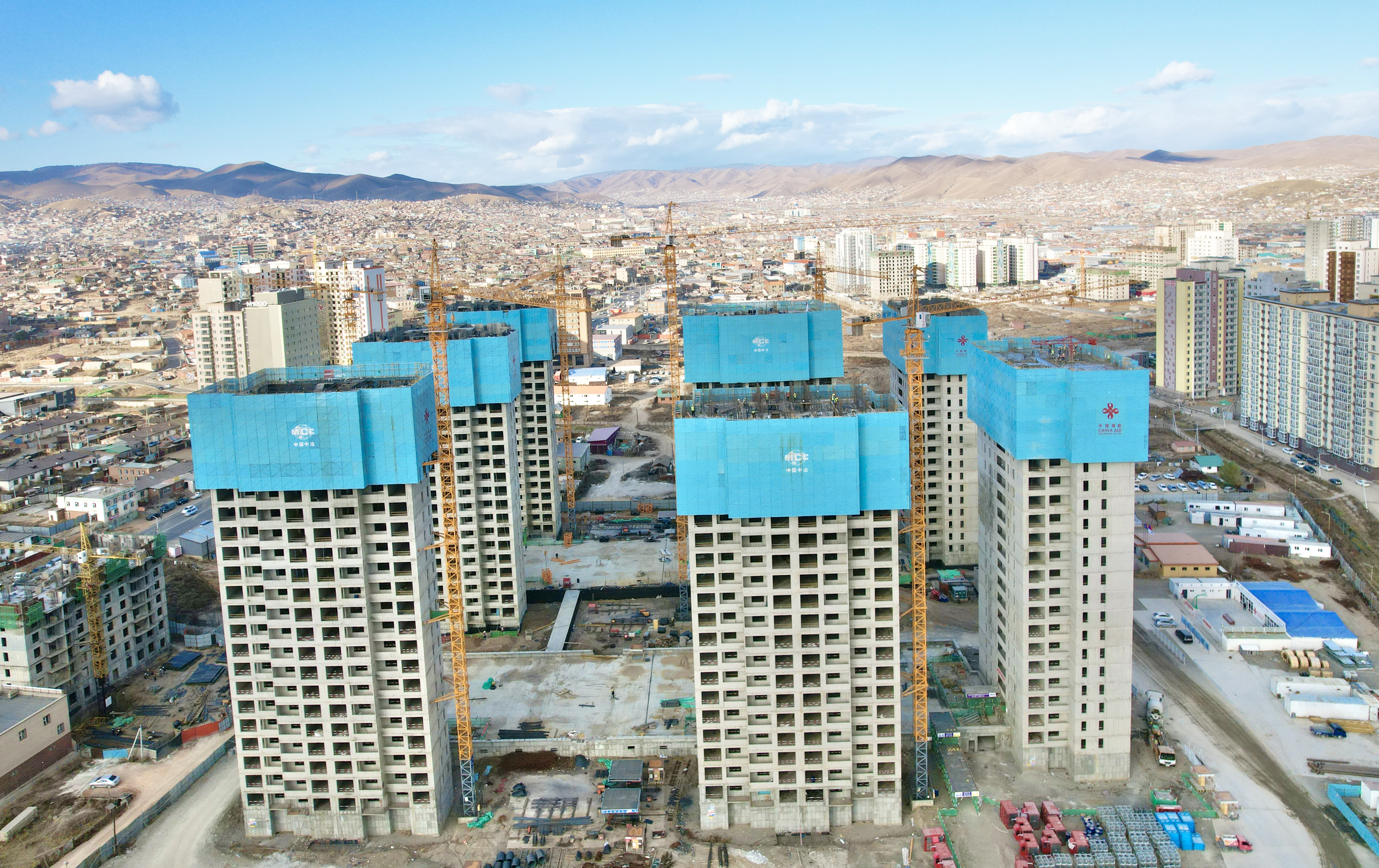 本项目位于蒙古国首都乌兰巴托市、托勒河畔,总建筑面积9.3954万平方米,主要包括8栋住宅楼、地下车库、配套设备用房、室外活动场地、小区道路、绿化硬化、外网等施工内容。其中,住宅楼地上21层,地下1层,主体为钢筋混凝土剪力墙结构,筏板基础,全部为精装修。工程开工建设后,中国二冶援蒙项目克服当地气候条件恶劣、两国施工技术差异大、材料供应短缺等不利因素,突破项目大体积混凝土浇筑体量大、施工工艺复杂,支撑体系庞大,质量要求高等施工难点,提前策划,科学组织,紧扣网络计划,历经春夏施工大干,8栋住宅楼快速向上攀升,首栋住宅5#楼实现封顶目标。