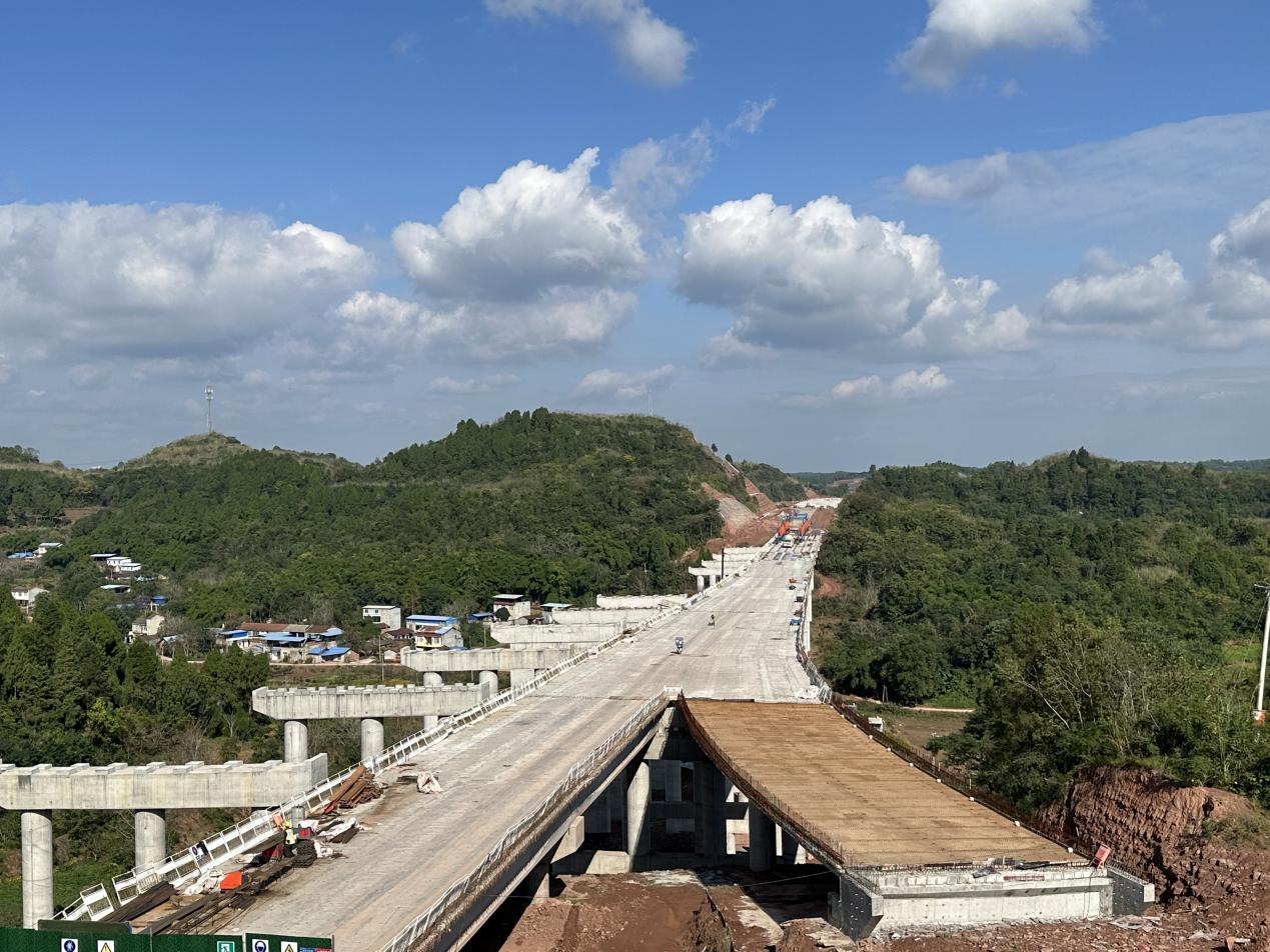 梓州大道南延线(省道424大林至仁寿段)工程位于四川天府新区眉山片区,全长17.284千米。该工程按一级公路标准双向6车道设计,路基宽48米,设计速度80千米每小时,共设置桥梁9座,天桥5座,涵洞及通道46道,穿龙泉山脉特长隧道1处,互通立交1处。主要建设内容包括道路工程、桥涵工程隧道工程、交安工程及相关附属配套设施。项目建成后,将提高区域路网密度,完善骨架路网,大力推动沿线地区经济发展,对成渝经济圈国家发展战略具有重要促进作用。