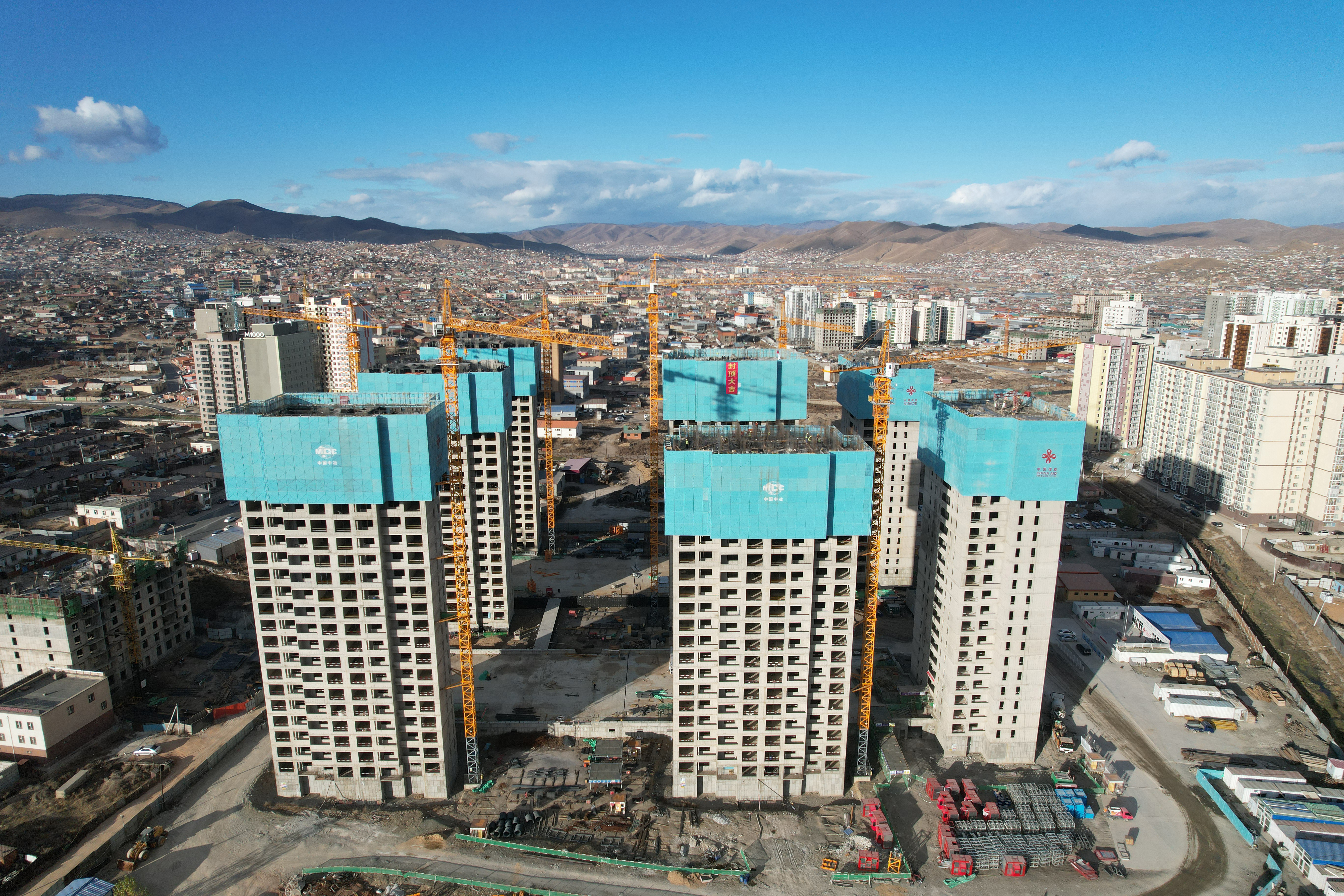 蒙古国棚户区改造项目是中蒙两国政府和人民共同关注的重要民生工程,是睦邻两国实施全面战略合作关系持续深入的友好见证。同时也是中冶集团全方位擦亮“一带一路”金字招牌的重要项目。本项目位于蒙古国首都乌兰巴托市、总建筑面积9.3954万平方米,主要包括8栋住宅楼、地下车库、配套设备用房、室外活动场地、小区道路、绿化硬化、外网等施工内容。其中,4#、8#两栋住宅楼均为地上21层,地下1层,钢筋混凝土剪力墙结构,筏板基础,全部为精装修。工程开工建设后,中国二冶援蒙项目建设者跨越山海,紧抓时间进度条,满卡施工斗志昂扬,攻坚克难跑出施工“加速度”,4#和8#住宅楼你追我赶,主体结构快速向上攀升,10月31日,随着两栋楼21层主体结构混凝土浇筑完成,标志着4#和8#楼同步实现封顶目标。