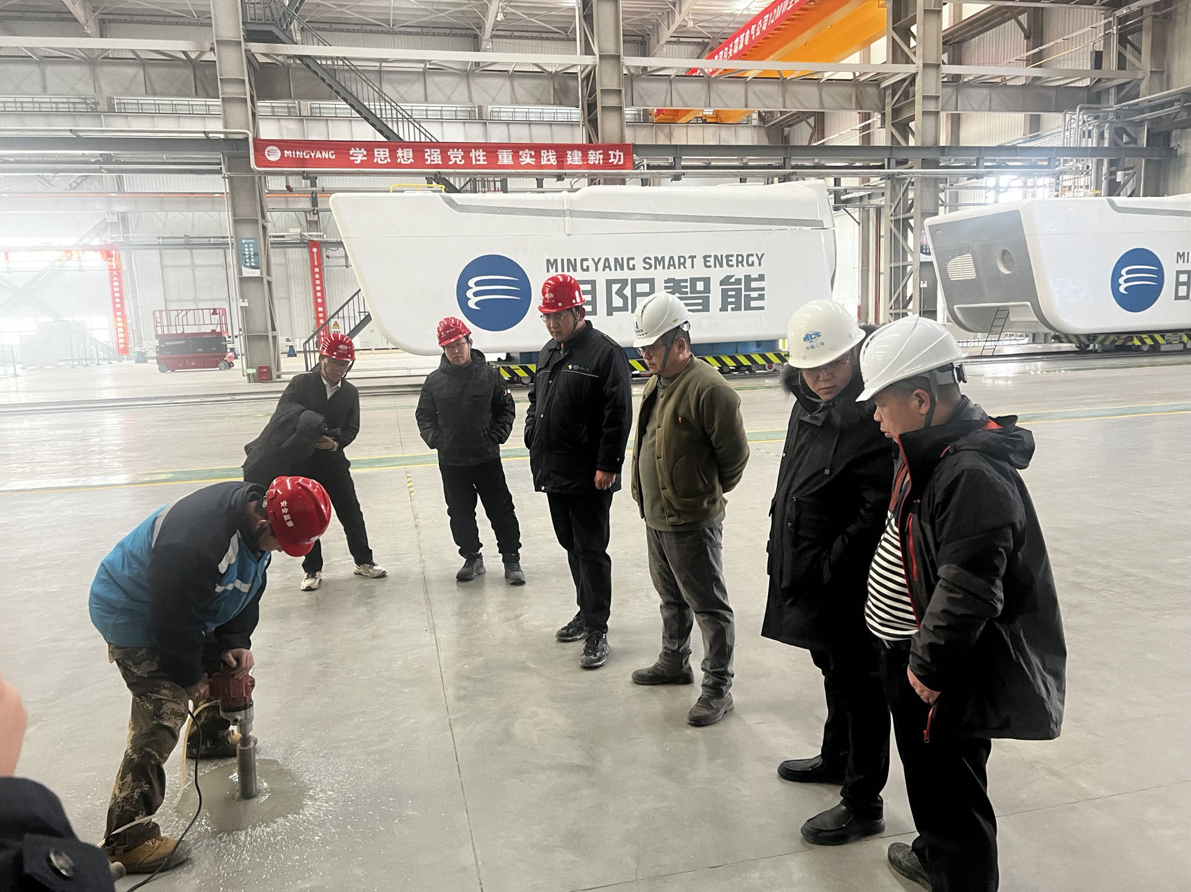 此次验收工作由明阳集团组织,各相关主体单位及其他参建单位共同参与,以确保工程质量和安全。通过实地察看,查阅相关资料,听取参建各方工作汇报和质量、安全主管单位的监督工作报告后,建设、监理、设计、地勘、施工等五方主体单位的共同评估,一致认为该项目达到了预期的目标和质量要求,项目质量合格,可以顺利通过竣工验收。至此,由项目部负责施工的叶片、整机土建、门窗及装修工程已全部完成并通过竣工验收。
