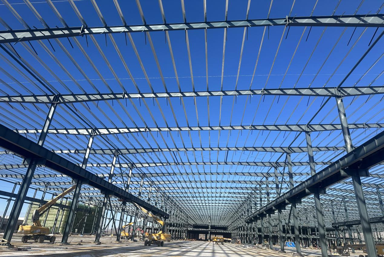 纬景储能锌铁液流电池(包头)智造基地建设项目,位于内蒙古自治区包头市青山区。项目建设用地面积约208075.97平方米,建筑面积约152150.68平米。厂房A区长199米,宽180米,单体建筑面积约36000平方米。结构形式为单层多跨刚架厂房,最大跨度40米。屋盖系统为焊接实腹屋面梁、冷弯薄壁C型檩条、角钢支撑,圆钢管系杆;柱子系统采用焊接十字型钢柱、纵向设置柱间支撑及刚性系杆;吊车梁系统采用焊接工字型实腹式钢吊车梁。
