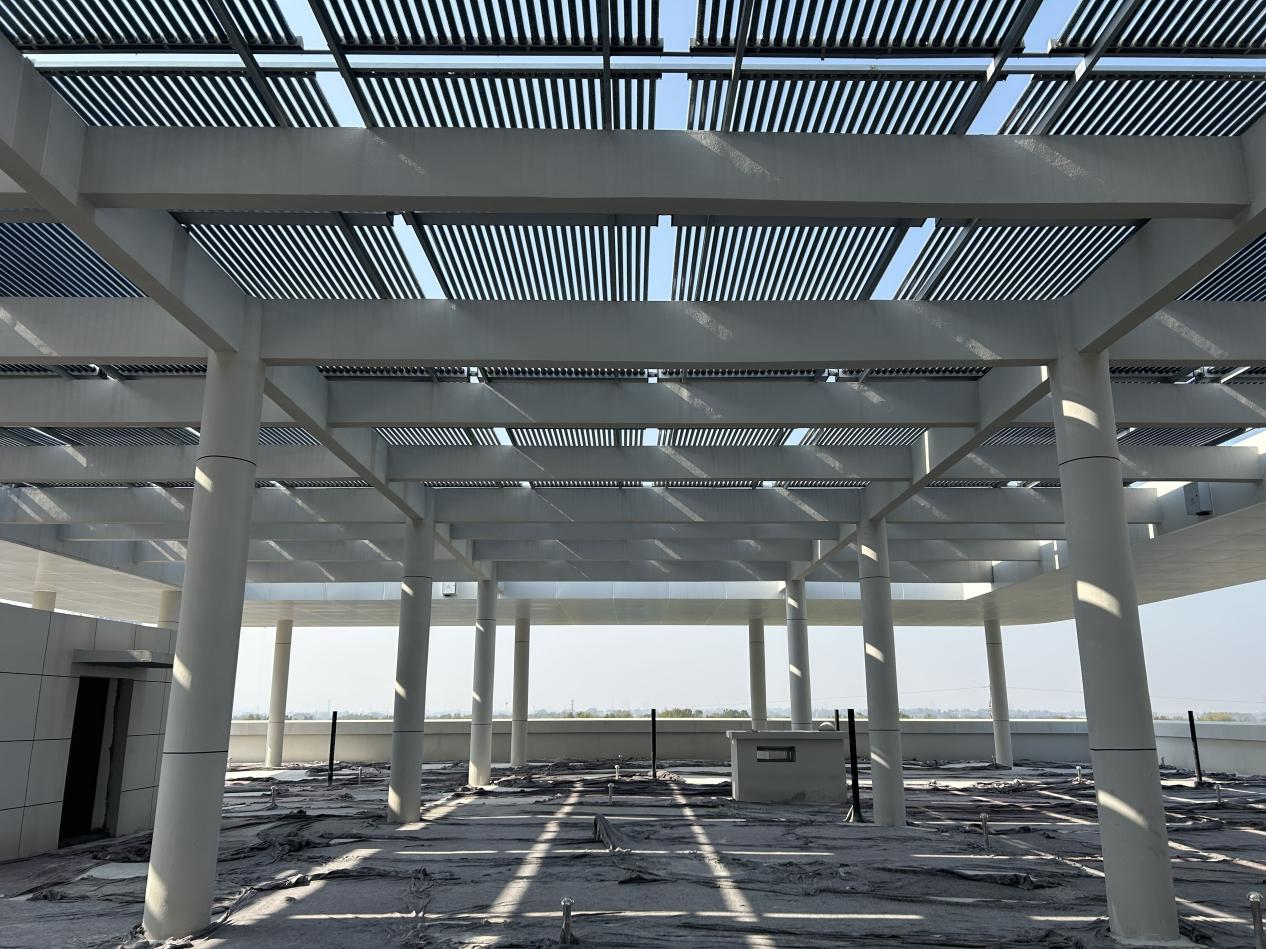屋面工程是项目建设的关键环节,其施工质量直接关系到建筑的整体美观与使用功能。本次施工涵盖防水层、混凝土面层、真石漆、太阳能及饰面层铝板安装等完整工序体系,技术要求高,施工组织复杂。面对屋面坡度控制精度要求高、交叉作业协调难度大等挑战,项目部通过优化施工方案、强化技术交底、实施全过程精细化管控,严格把控材料质量、工艺标准和成品保护,确保屋面平整度、排水坡度等关键指标符合设计要求,为实现建筑完美外观提供了有力保障。门诊楼屋面工程的顺利完成,为项目后续各楼屋面施工积累了宝贵经验。