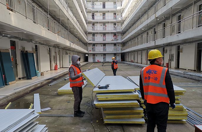 中国一冶突击队在仪表电子学院“方舱医院”建设现场