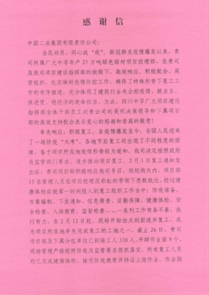 2月29日,四川中孚广元建设项目指挥部向中国二冶致感谢信,对中国二冶冶金分公司四川广元中孚年产25万吨绿色铝材项目经理部扎实做好疫情防控工作的同时,率先响应,积极复工,展现央企控疫情、挺业主、保进度、稳经济的使命担当表示感谢。