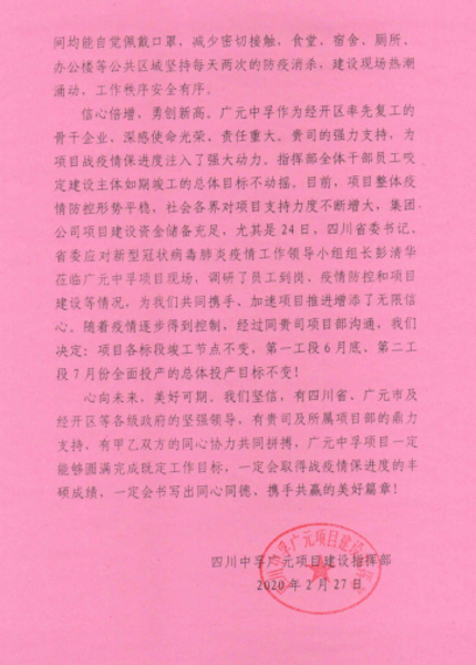 感谢信中指出,自疫情暴发至今,广元项目部在收到复工通知后,积极响应,短短两天内,项目部15名管理人员到岗,经过健康体检后第一时间投入到复工组织工作当中,一系列工作有条不紊,执行有力。截止2月26日,施工作业人员达到330人,开辟作业面9个,现场管理严格,按照防疫与监管要求狠抓各项工作落实。在防疫与复工两手抓的同时,2月24日迎来了四川省委书记、省委应对新型冠状病毒肺炎疫情工作领导小组组长彭清华莅临广元中孚项目现场调研员工到岗、商情防控和项目建设情况,为我们共同携手,加速项目推进增添了无限信心。