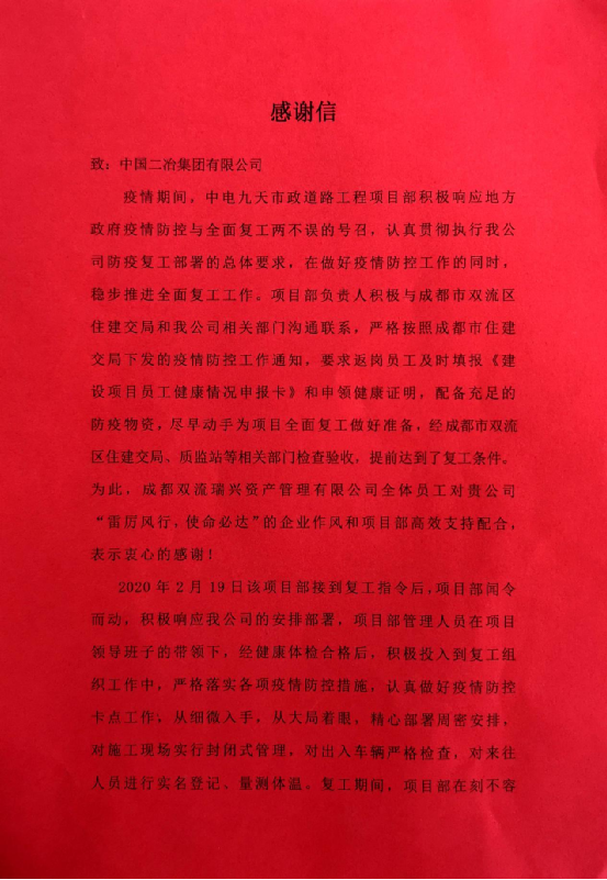 3月3日,成都双流瑞兴资产管理有限公司致中国二冶集团感谢信,赞扬中国二冶四川分公司中电九天项目部在疫情防控期间积极主动与成都双流区住房建设和交通运输局、瑞兴资产管理公司有关部门沟通联系,按照疫情防控通知及时填报返岗员工健康证明,配足防疫物资,为全面复工做好充分准备并提前达到复工条件,对中国二冶“雷厉风行、使命必达”的企业作风和高效支持配合表示衷心感谢。
