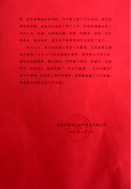 感谢信中指出,四川分公司接到复工指令后,项目部领导闻令而动快速落实安排部署,全身心地投入到复工组织工作中,从细微入手,从大局着眼,对施工现场实行全封闭式管理。在科学防疫的同时,周密部署项目复工,及时解决项目中存在的疑难问题,克服一切困难,创造有利条件,排兵布阵,稳妥有序推进项目复工复产。