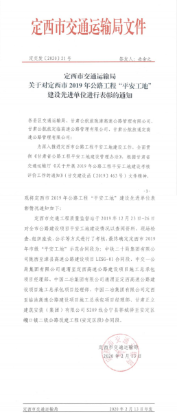 3月24日,从定西市交通运输局下发的文件获悉,中国二冶路桥分公司通渭至定西高速公路工程项目部,被评为定西市2019年度公路工程“平安工地”建设先进单位。