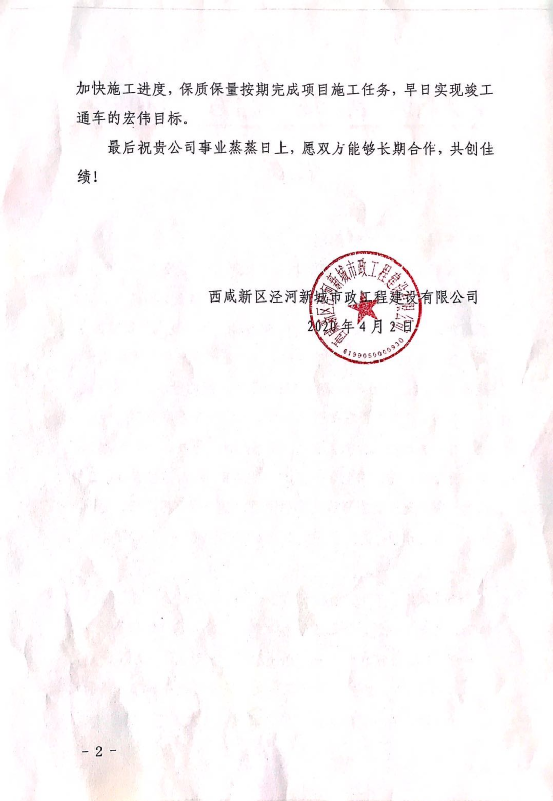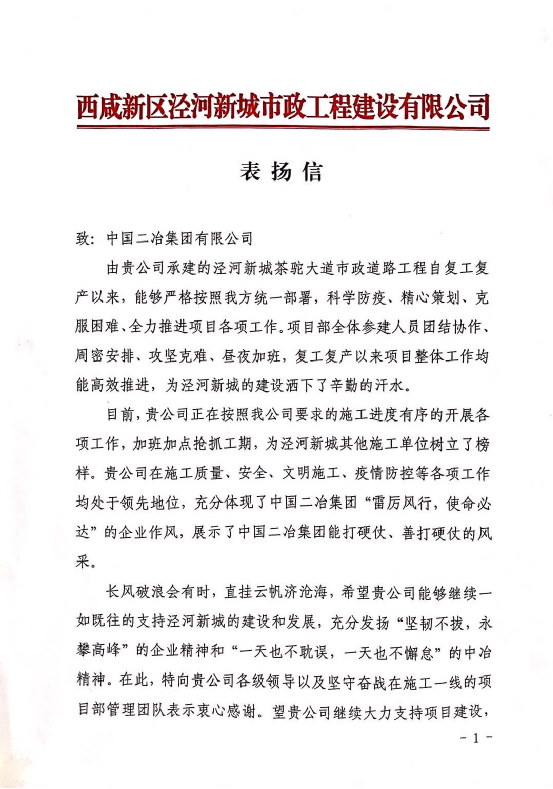 信中说道,中国二冶集团在施工质量、安全、文明施工、疫情防控等各项工作均处于领先地位,充分展现了中国二冶集团“雷厉风行、使命必达”的企业作风,为泾河新城其他施工单位树立了榜样。希望中国二冶集团能够继续一如既往的支持泾河新城的建设和发展,大力支持项目建设,加快施工进度,保质保量按期完成项目施工任务,早日实现茶驼大道市政道路工程竣工通车的目标。