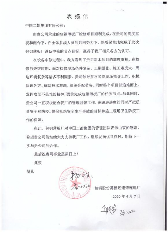 包钢薄板厂在表扬信中赞扬了中国二冶包钢检修项目部对于中修工作的重视和不畏艰难的精神,对项目部积极配合厂内的管理监督和对卫生防疫工作所做的工作给予了肯定,并期待与中国二冶集团进行下一次的合作。