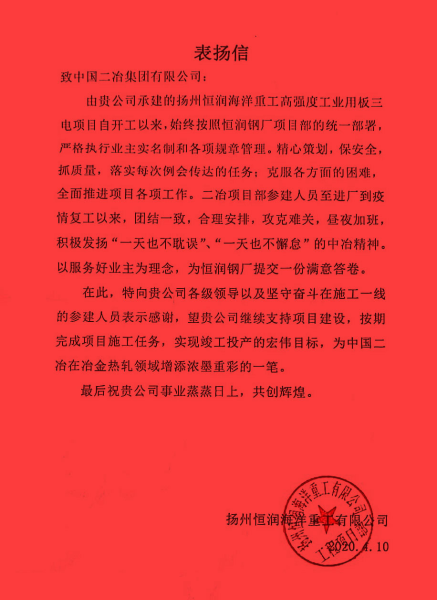 表扬信指出,冶金分公司扬州恒润海洋重工工业用板三电安装工程项目部在面对疫情期间,严格执行业主各项规章制度,克服各种困难,在施工中精心策划,保安全、抓质量,昼夜加班,以服务好业主的理念,攻克难关,积极发扬“一天也不耽误,一天也不懈怠”的中冶精神,为恒润钢厂提交了一份满意答卷。