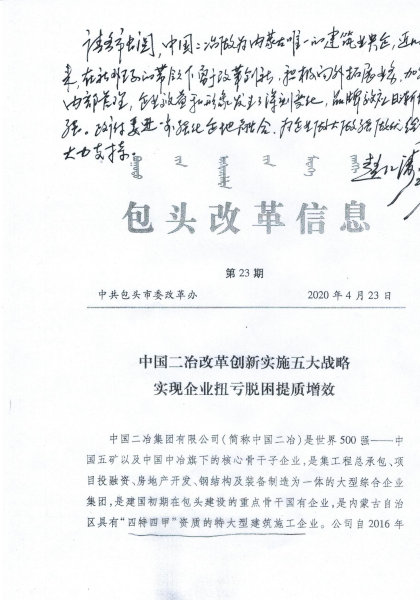 近日,中国二冶调研文章《中国二冶改革创新实施五大战略实现企业扭亏脱困提质增效》获包头市委副书记、市长赵江涛批示并给予充分肯定。批示指出:中国二冶作为内蒙古唯一建筑业央企,近几年来,在新班子带领下勇于改革创新,积极向外拓展业务,加强内部管理,企业效益和形象发生了深刻变化,品牌效应日渐增强。政府要进一步强化企地融合,为企业做大做强做优给予大力支持。