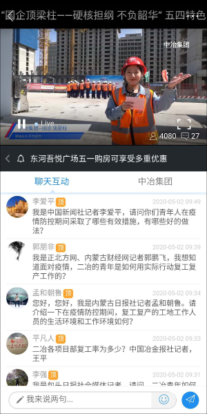 中国经济日报记者余健表示:这次直播,让我比较感兴趣的就是以“在线直播+线上采访”的形式让我们媒体记者走进中国二冶项目,实地看到了二冶项目大干二季度劳动竞赛施工现场一派生机勃勃的景象,通过线上访谈,更看到二冶青年在疫情防控和复工复产关键大考中,应对危机青春勇担当的新形象。在疫情期间云端宣传活动这种形式既避免了人员聚集,又最真实地呈现了项目建设情况。最别出心裁的亮点就是直播最后线上听取讲团课活动,我感觉非常棒!