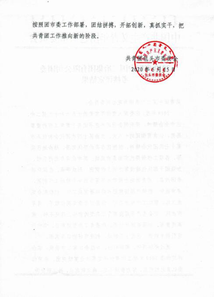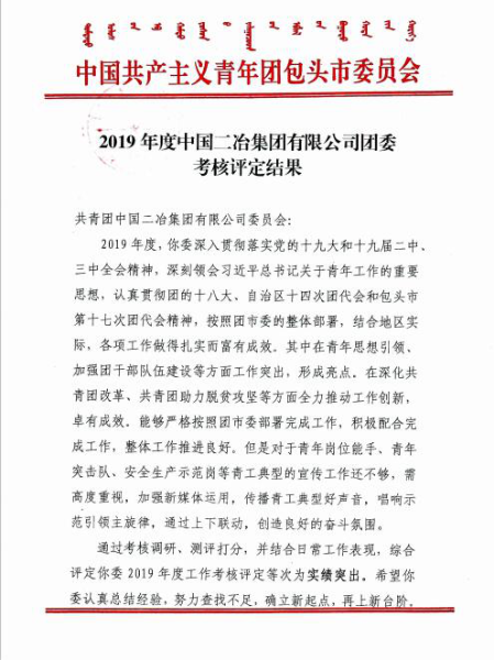 近日,共青团包头市委员会发来信函,中国二冶团委被评定为2019年度全市“实绩突出”贡献单位,为公司树立良好企业形象起到了积极作用。