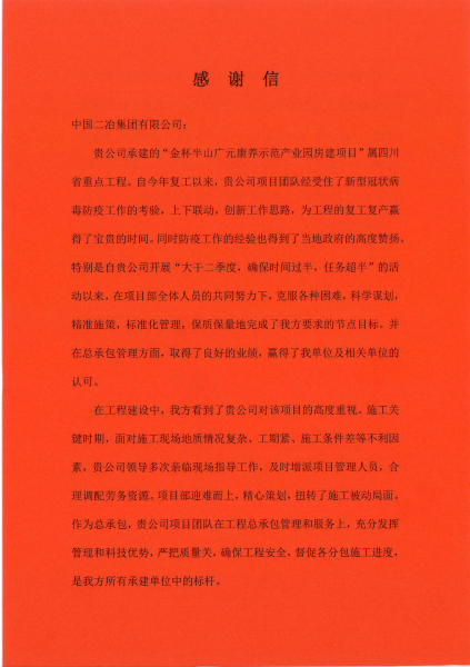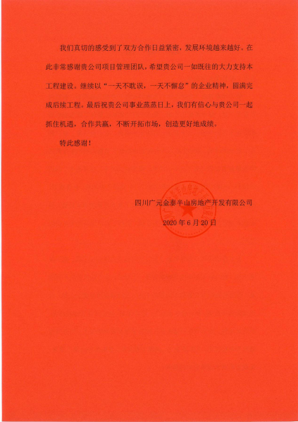 6月20日,四川广元金泰半山房地产开发有限公司致中国二冶集团感谢信,对中国二冶在广元康养示范园康养社区房建工程项目中,克服工期紧、任务重、难度大等诸多困难,安全、高效、优质完成节点目标,如期实现合同履约表示衷心感谢。