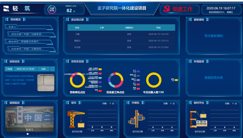 一直以来,如何搞好施工现场质量和安全管理的问题,是项目部、施工企业与政府管理部门共同关注的焦点。为响应中国二冶集团号召,山东区域分公司将智慧工地的理念制定为“打造智慧工地,专注智慧建设,争创精品工程”。在中国二冶集团的搭建与指导下,山东区域分公司首先通过轻筑智慧建设云平台来解决工地现场各种智能设备、信息系统数据采集、上传、分析的问题,依托轻筑智慧建设云平台进行信息的汇总与提取,再通过新建的数字智慧管控平台详细了解各在建项目的动态信息。据了解,轻筑智慧建设云平台主要展示项目动态、安全质量巡检内容、人员定位分布、视频监控、塔吊监测数据、卸料平台监测数据、升降机监测数据、环境监测数据等信息。通过轻筑项目部大屏端有效解决了施工部门安全隐患发现难、施工环境不理想、多头监管应对累、管理成本压力大等难题,打造智慧、安全、绿色、便捷的施工工地。
