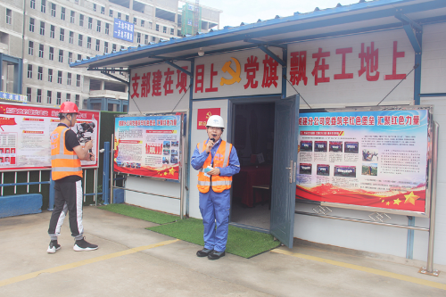 项目部年轻的解说员正在介绍项目党建生活区建设者职工之家活动