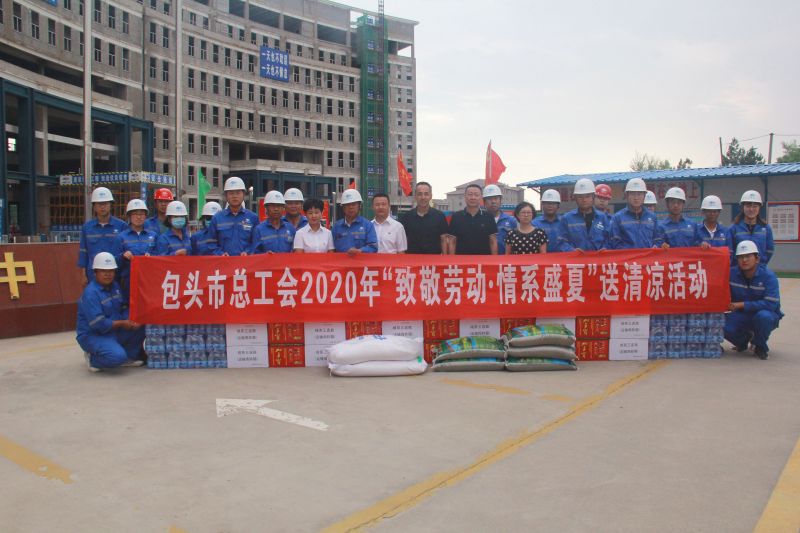 7月14日,包头市总工会副调研员,办公室主任殷枢衡、主任马俊一行,在城健分公司党委书记王蒙强、公司党群工作部副部长王志义、工会相关人员的陪同下,来到中国二冶包头高技能人才公共实训基地工程开展“致敬劳动、情系盛夏”送清凉慰问活动,将绿茶、矿泉水、白糖、绿豆等防暑慰问品送到一线职工手中。