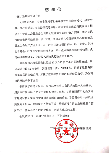 10月26日,甘肃省陇南市礼县交通运输局发来感谢信,对中国二冶集团甘肃分公司景礼项目部在抗洪救灾活动中做出的突出贡献表示衷心感谢。