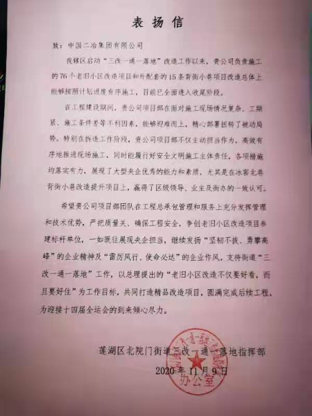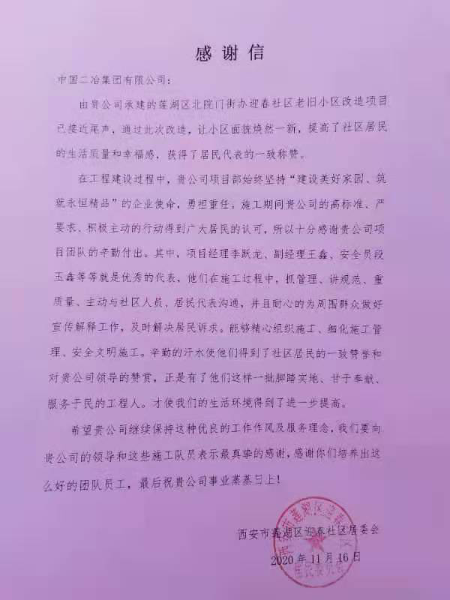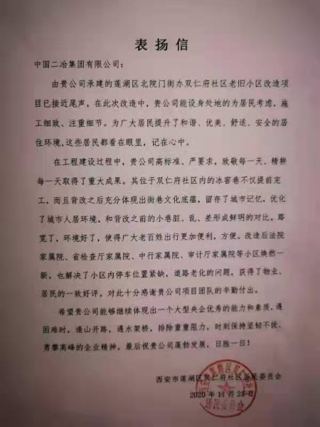 近日,由中国二冶集团承建的莲湖区老旧小区改造工程连续收到莲湖区北院门街道三改一通一落地指挥部、西安市莲湖区双仁府社区、西安市莲湖区迎春社区多封感谢信及西安市莲湖区迎春社区、大学习巷劳动局家属院锦旗,这些感谢信和锦旗中体现了老旧小区改造之后当地政府和民众对中国二冶的感谢。
