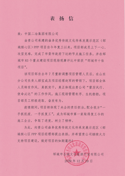 表扬信中指出,曲阜优秀传统文化传承发展示范区(邹城核心区)PPP项目自今年复工以来,项目部成员上下一心、攻坚克难,完成了市委市政府下达的节点施工任务,并在邹城市83个重点建设项目现场观摩评比中荣获“邹城市十佳项目”。
