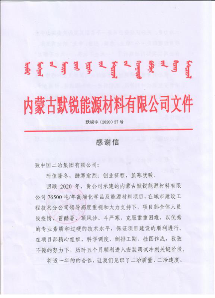 感谢信中指出:回顾2020年,贵公司承建的内蒙古默锐能源材料有限公司76500吨电/年高端化学品及能源材料项目,在中国二冶集团及城市建设工程技术公司领导高度重视和大力支持下,项目部全体人员战疫情、冒酷暑、顶风沙、斗严寒,克服重重困难,以优秀的专业素质和过硬的技术水平,保证项目建设的顺利进行。在项目部精心组织、科学调度、倒排工期、挂图作战,孜孜不倦的努力下,历时五个月顺利进入安装调试冲刺关键阶段。将近一年的合作,让我们见识了二冶质量、二冶速度、二冶力量,充分证明贵公司是一个名副其实的央企实力企业。项目经理部是一个“敬业、忠诚、担当、争先”的优秀集体。我公司非常珍惜通过合作凝结成的深厚友谊和感情,在项目安装调试冲刺关键阶段,我们将进一步加强沟通、精诚合作,全力以赴配合贵公司项目部全体人员,以更加饱满的热情,高质量完成工程及设备安装调试,圆满实现试产投产预定目标任务,并向中国二冶所有参建人员表示衷心的感谢和崇高敬意!