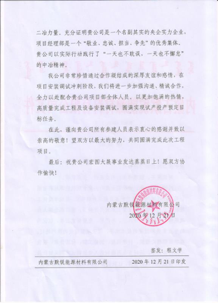 12月21日,内蒙古默锐能源材料有限公司向中国二冶集团发来感谢信,对在合作过程中中国二冶集团体现央企的实力担当,以及用实际行动践行的“一天也不耽误,一天也不懈怠”的中冶精神给予高度赞扬。