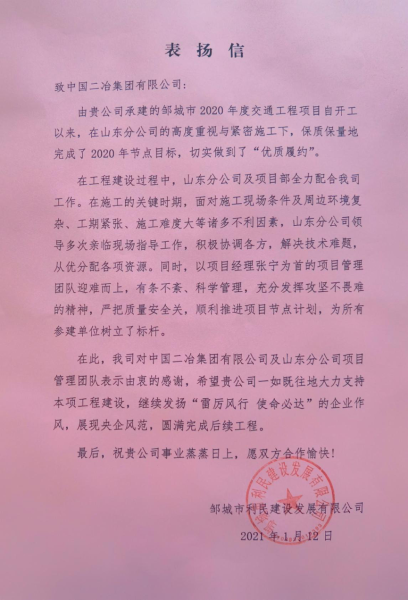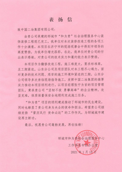 1月12日至13日,中国二冶集团连续收到两封表扬信,对中国二冶集团先后在邹城市“和为贵”社会治理服务中心装饰装修工程项目、邹城市利民交通工程项目中的出色表现表示肯定,对项目团队的拼搏奉献,圆满完成施工任务给予高度评价。