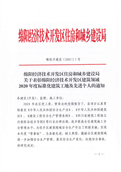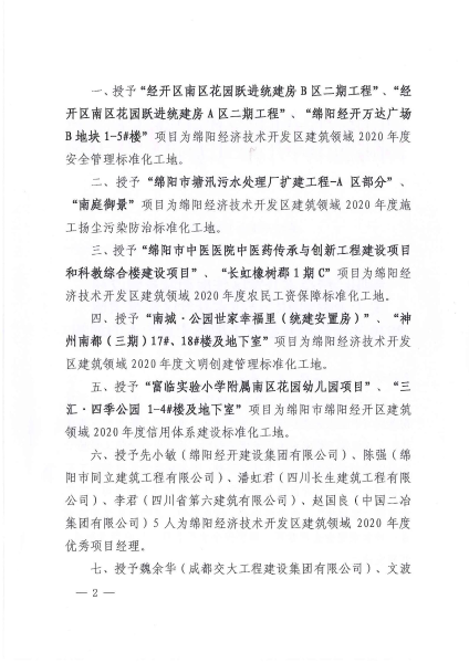 1月18日,从绵阳经济技术开发区住房和城乡建设局获悉,中国二冶经开区南区花园跃进统建房A、B区项目分别荣获“绵阳经济技术开发区建筑领域2020年度安全管理标准化工地”称号,同时,项目经理赵国良被授予“绵阳经济技术开发区建筑领域2020年度优秀项目经理”。