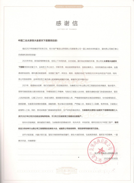 感谢信中指出,2020年初,中国二冶在太原恒大金碧天下首期项目复工复产中,全体员工齐心协力、尽职尽责,响应政府防疫号召,发扬迎难而上、攻坚克难的战斗精神,全面建成防疫战线,顺利通过政府验收,并安全、高效、优质地完成了该项目2020年全年的生产任务。为确保工程建设的有序推进、稳步提升,公司发扬了认真负责的态度、办事高效地工作精神,希望公司确保防疫物资、生产材料的稳定供应,力保太原恒大金碧天下首期项目复工职工能够在节后有序到场,按期实现工程建设全面复产。