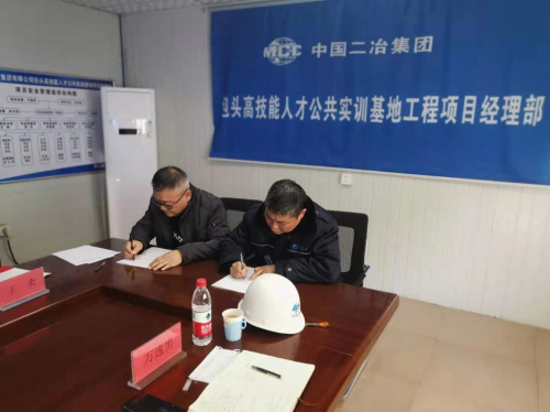 会上,包头市人社局技能鉴定指导中心主任朝格图与中国二冶包头市实训基地项目部项目经理万逸男代表双方签订《安全质量责任书》。