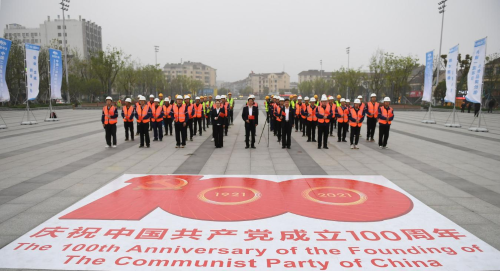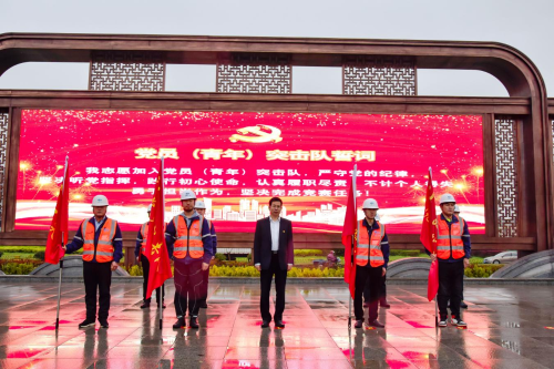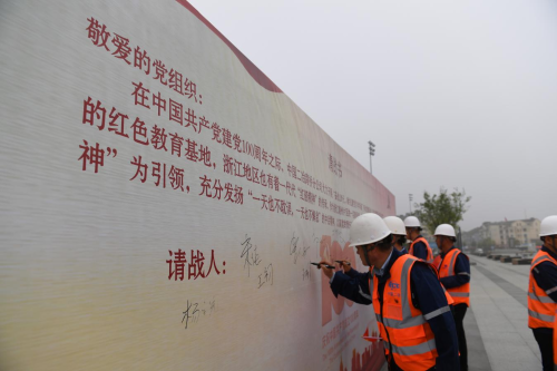 在学党史、悟思想环节中,建设者们在中国二冶承建并完成的湖州市练市镇振兴广场上重温入党誓词,坚定作为一名共产党员的理想信念;向党员突击队和青年突击队授旗,突击队代表表达了“坚决听党指挥,践行初心使命,认真履职尽责,勇于担当作为”的决心;在全体职工签名的请战书中,立下了“作为浙江湖州片区的建设者,承诺以开天辟地、敢为人先的红船精神为引领,充分发扬‘一天也不耽误,一天也不懈怠’ 的中冶精神,以高度的责任感和使命感践行央企责任担当,履行光荣使命。”的铮铮誓言。 活动中,全体职工合唱《唱支山歌给党听》,用歌声缅怀历史、展望未来、传承“红船精神”,歌声催人奋进,气势振奋人心。在大气磅礴的歌声和旋律中,感受到中国二冶职工对党和国家的热爱,感受到中华民族沧桑历史,感受到二冶人昂扬的斗志。在弘扬爱国精神,重温红色经典的同时,号召大家把如火的热情投入到工作中去,不忘初心,砥砺前行,以优异的成绩迎接中国共产党成立100周年。