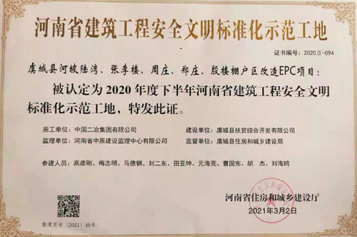 4月1日, 中国二冶钢构分公司承建的虞城棚改项目被河南省住房和城乡建设厅评为 2020年下半年“省级建筑施工安全标准化示范工地”称号 ,这是该项目部成立以来继获得商丘市“安全标准化示范工地”称号后获得的又一荣誉,实现了该公司在中原地区省级安全文明施工奖项方面零的突破。