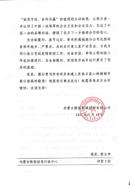 4月19日,内蒙古默锐能源材料有限公司向中国二冶发来感谢信,对在合作过程中所见证的中国二冶作为央企的实力担当,以及用实际行动践行的“一天也不耽误,一天也不懈怠”的企业精神给予高度赞扬;对城建分公司领导给予该工程的高度重视、大力支持表示衷心感谢;对承担该工程建设任务的达旗项目部全体工作人员以优秀的专业素质和过硬的技术水平,保证项目的顺利进行给予充分肯定和高度赞扬。