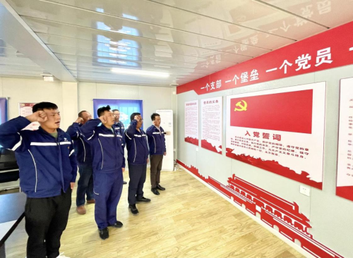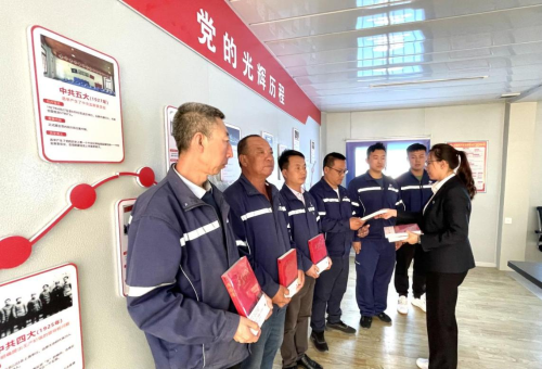 在学党史、悟思想环节,新型建筑分公司副总经理带领大家学习《弘扬西柏坡精神》,观看西柏坡教育视频,举行授旗仪式,并在党旗下重温入党誓词。通过分享西柏坡的故事、赠送《西柏坡精神》等学习书籍,用革命先烈们坚韧不拔、无私奉献的精神鼓舞大家坚守初心使命,展示了项目部在工程建设中积极发挥党支部战斗堡垒作用,引导广大党员干部做到学史明理、学史增信、学史崇德、学史力行,激励党员干部深耕细作、精细管理,在党史学习教育中立足本职工作,把红色教育的收获转化为扎实做好本职工作的动力。