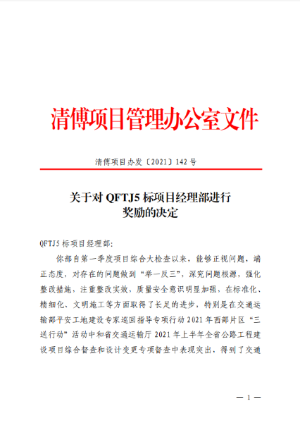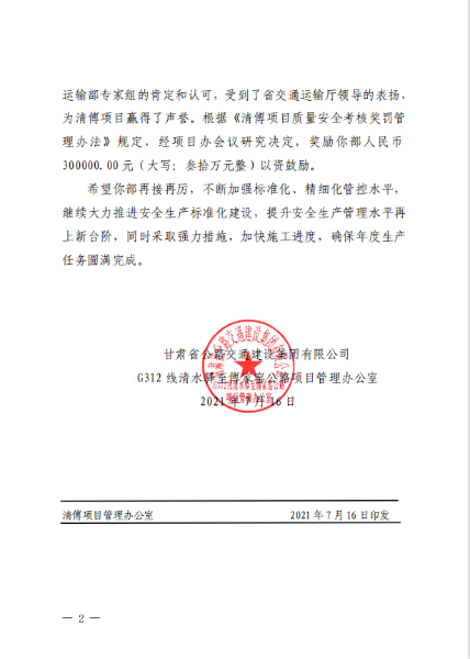 7月20日,因中国二冶集团清傅项目部在交通运输部平安工地建设专家巡回指导专项行动 2021 年西部片区“三送行动”活动中和省交通运输厅 2021 年上半年全省公路工程建设项目综合督查和设计变更专项督查中表现突出,获得清傅项目办奖励人民币30万元。
