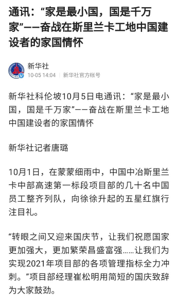 10月5日,新华社以《“家是最小国,国是千万家”——奋战在斯里兰卡工地中国建设者的家国情怀》为题对中国中冶斯里兰卡中部高速第一标段项目部进行特别报道。项目工作人员在采访中表示,“家是最小国,国是千万家”,作为在海外参与“一带一路”项目的建设者,我们怀有一种使命感和责任感,尽管有时需要为此作出个人牺牲。当看到通过自己的努力,斯里兰卡基础设施日新月异、旅游业蓬勃发展,我们感到由衷高兴和自豪。