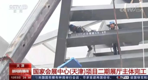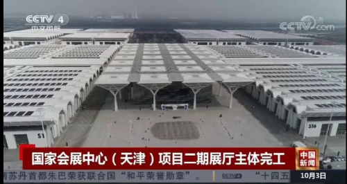 10月3日,央视新闻频道 (CCTV-13)《新闻直播间》栏目、中文国际频道 (CCTV-4)《中国新闻》栏目分别对中冶钢构参建的国家会展中心(天津)项目进行了报道。节目通过航拍镜头和各类特写镜头,全景式呈现了中冶钢构承建的中央大厅、东入口大厅、夹壁墙柱和天桥等钢结构工程以及部分金属屋面工程,展现出中冶钢构的专业实力与品牌影响力。